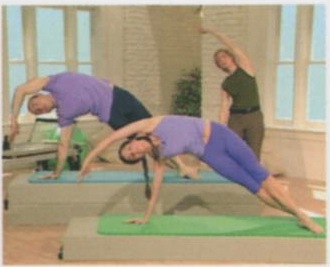 This is yet another Pilates DVD where the instructor doesn’t actually do the exercises herself. Moira lurks behind her helper people, who dutifully obey her commands with silent smiles, a profound emptiness in their eyes.