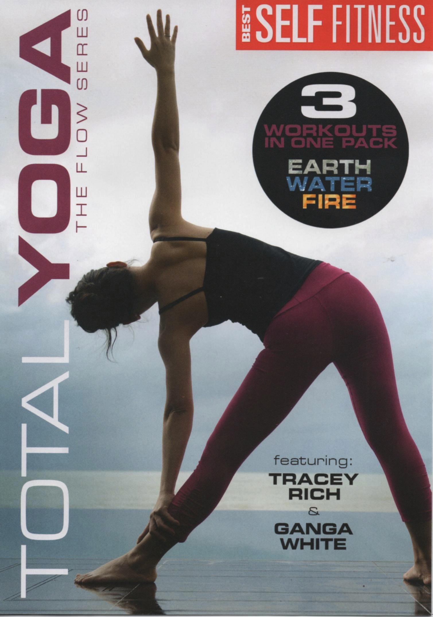 New Age music sweeps us away to a land of peace and contentment. We journey to the mindscape of Tracey and Ganga, with fluffy clouds in the distance. The instructors are positioned on a round wooden platform that represents the elemental plane. When the voice-over instruction begins, the otherworldly ambience is shattered. No soft, breathy, soothing yoga voice here. This is the hard, flat, twangy school, and ya’ll better saddle up, Buttercup, and get to some Ujjayi Breathin’.