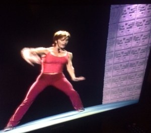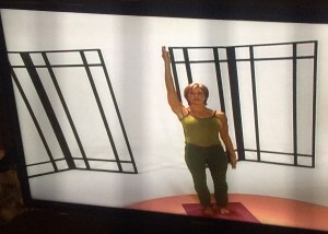 When we get to the Yoga Sculpt routine, it seems as if Karen has died and gone to yoga heaven. She’s waiting outside the Pearly Gates for St. Peter to call her name.