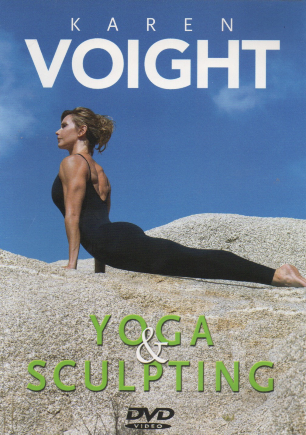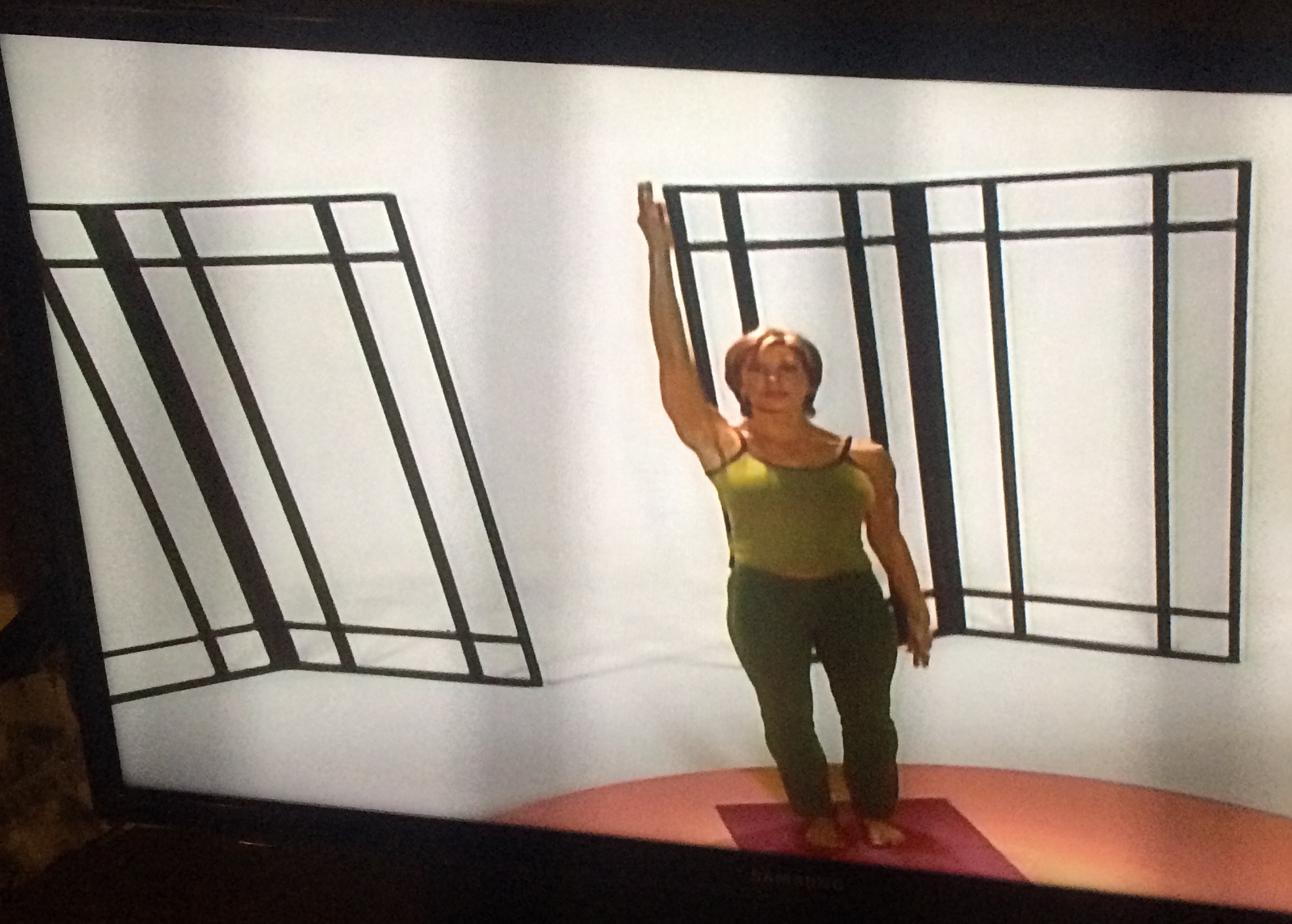 The back cover of this DVD demands that you “lift your spirit and redefine your body for good” with this collection of yoga and sculpting routines. Prominently featured in the set design is a logo of the host’s initials, arranged like an algebra symbol.