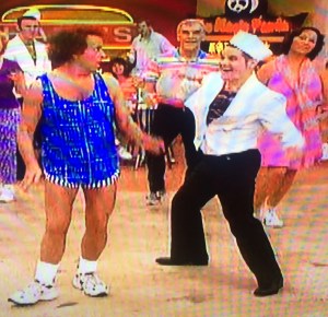Richard Simmons brings every bit of his enthusiasm and stagecraft that we know and love him for. He first appears in an electronics store display, demanding from a TV screen that we all get together and sweat! Then he emerges, and all the passersby gather into aerobics formation in the food court. As an imitation Whitney croons the lyric, “I wanna dance with somebody who loves meeeee,” Richard leads a bit of choreography that looks like a heart beat, shouting at the camera, “This is for you!”