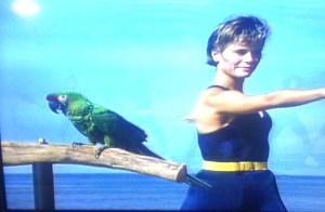 This green Macau remains, vigilant and attentive, for the duration of the one-hour aerobic workout. It’s his rightful place. You’ll notice that his has his own perch set up for him. But why is this necessary? The answer is clear. The woman next to him is obviously a witch, and she and this majestic bird share a soul. When she feels pain, he weeps. His tears are bottled and kept as treasures, for they have healing properties.