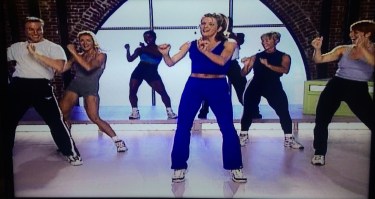 Kathy Smith leads her pack of devotees with the squealing enthusiasm of an Herbalife Double Diamond distributor. Some of them wear headset mics also, but the most they are allowed to contribute is a peppy exclamation of “yeah” or “wooot.” Kathy, who surely had another life as a Kim Cattrall stunt double, allows them to rotate through so they each get camera time up front with her. This casual bestowment of favors is sure to guarantee their loyalty when the FBI comes to investigate claims of fraud, money laundering, trafficking, and whatever the hell else a multi-level marketing cult allegedly does.