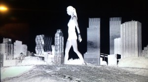 The image pulses between black-and-white and color, as if doing a side plank at an obvious murder scene isn’t weird enough. From this angle she can get a good view of the dead body: