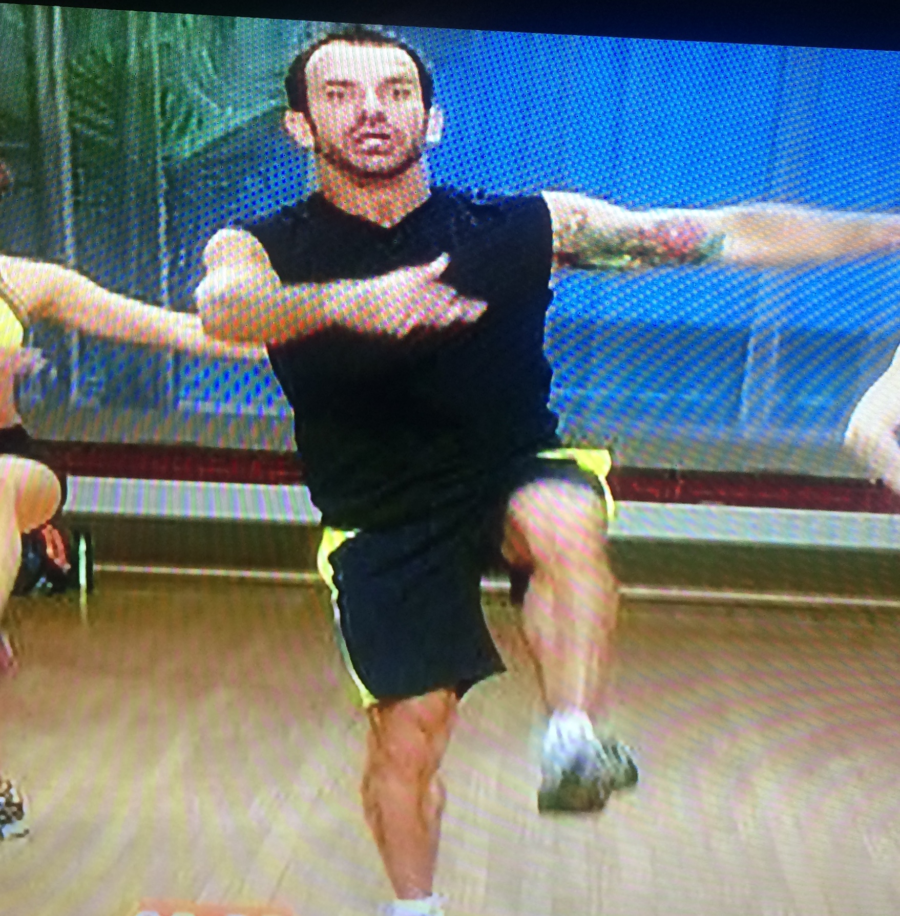 One of the moves is the Ipanema Walk, an almost impossible balance challenge of an eight-part squat with swinging legs and arms. Even Leandro looks terrified: