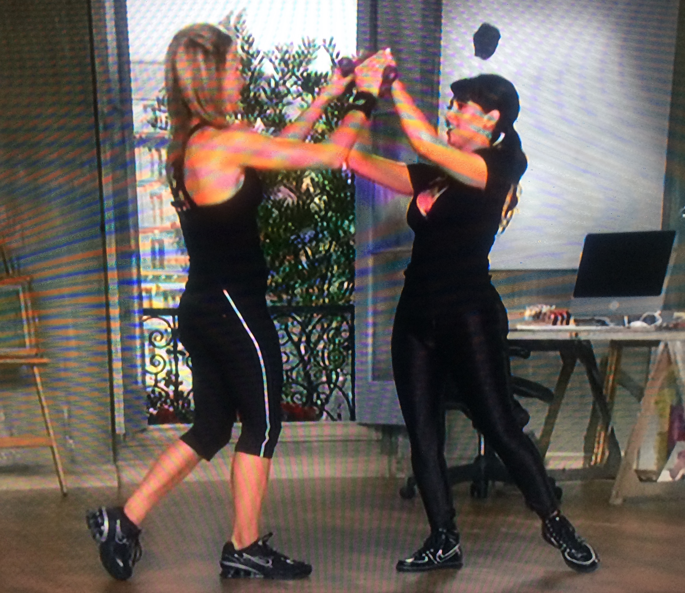 Kim Kardashian is with celebrity trainer and good-natured Yes Gal Jennifer Galardi. They lead us in a warmup so we can get our blood moving and so Kim can practice interrupting Jennifer every time she tries to give instructions.