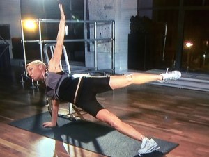 Now we start the whole thing over on our other leg. Oh boy. Good news, by the time you get through all the leg torture, there’s only ten minutes left in the workout.