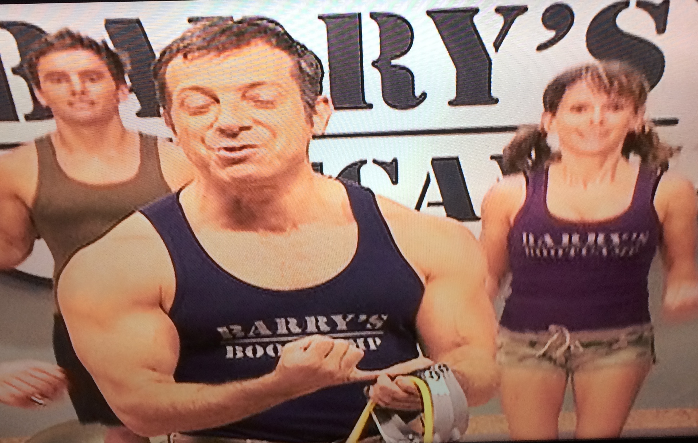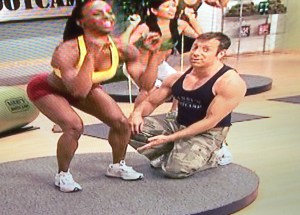 She does the lion’s share of demonstrating the exercises as Barry yells, or to be diplomatic, “cares loudly.” Barry spends a lot of time trying to look down Cindy’s sports bra, seemingly unaware that there is a camera on him at all times.