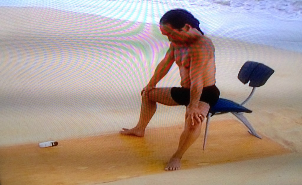 After some chair-assisted Triangle Poses, Rodney gets down on his plywood to demonstrate spinal extensions and twists.