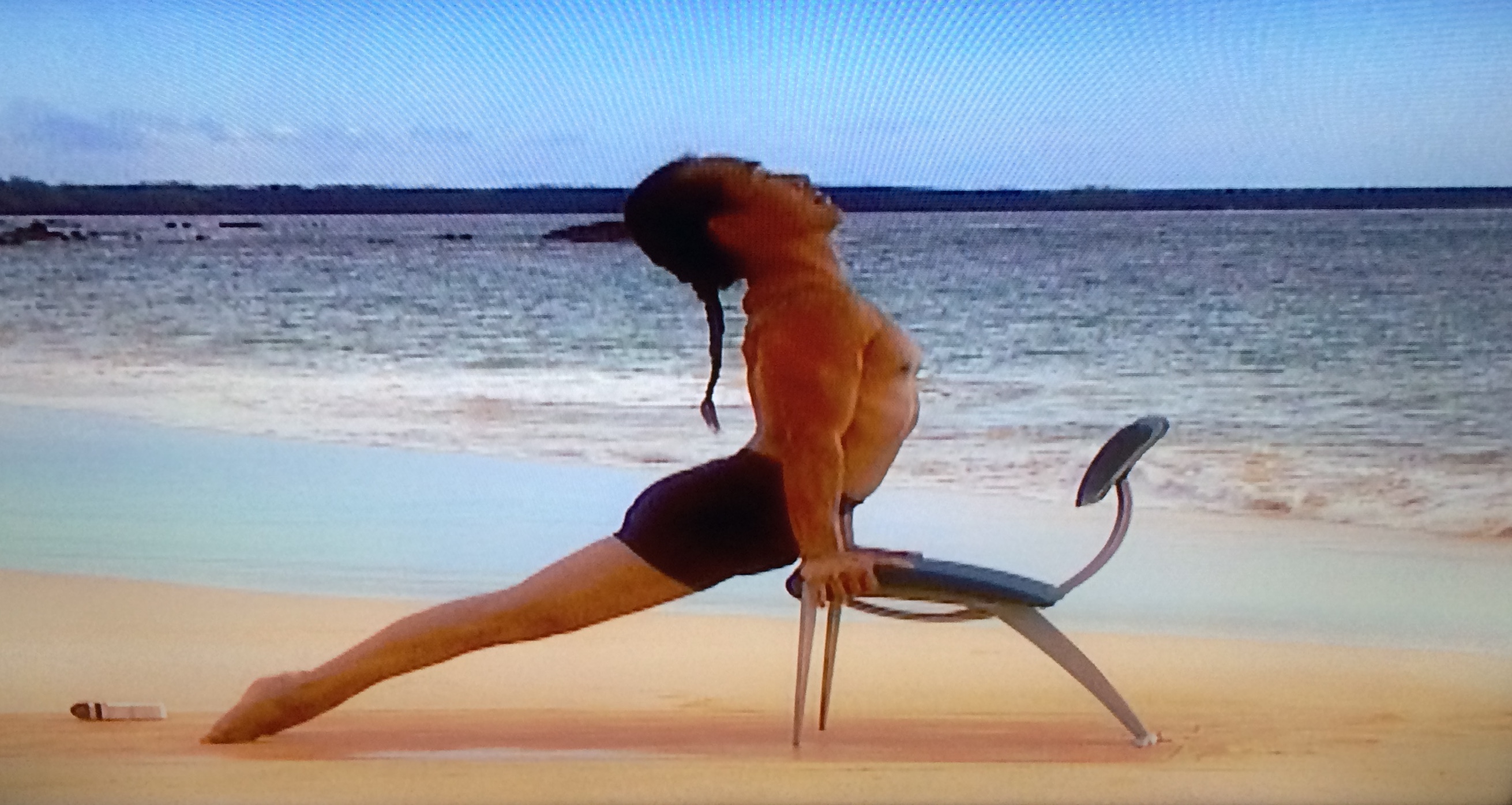 Instead, Rodney Yee smugly demonstrates the poses in his tiny shorts, letting the shot pan over his perfectly toned body, objectifying him the way female fitness hosts usually have a camera pointed directly down their sports bra. We’ve come a long way, Baby.