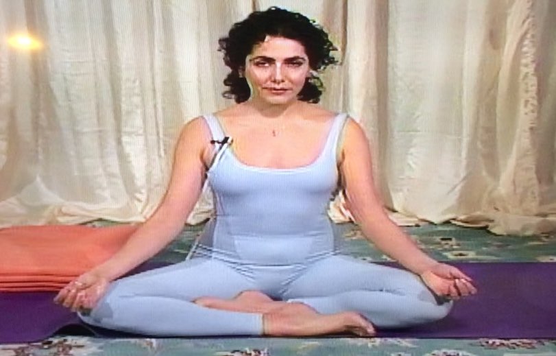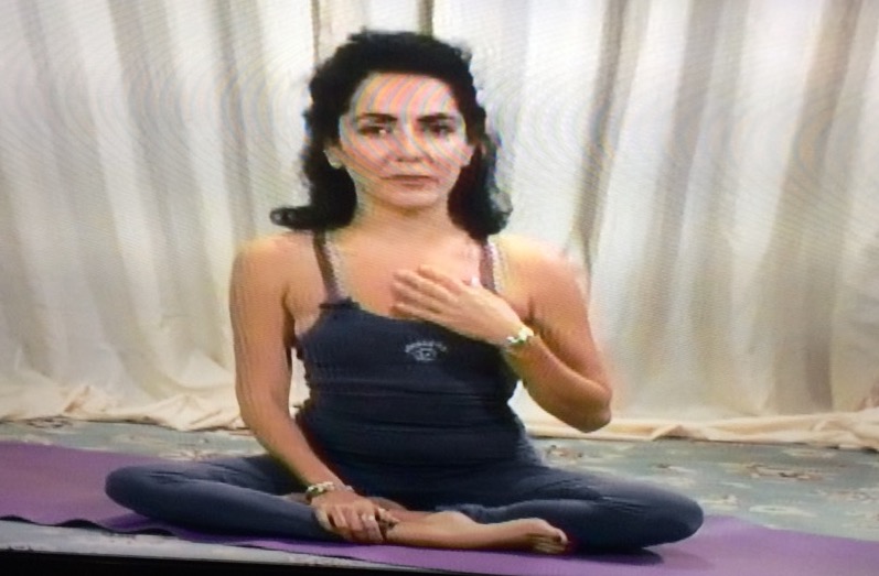 Yogi Marlon demonstrates proper breathing technique as she traces a finger up and down the front of her body in a manner that could only be described as seductive, yet awkward, like that music video of a teenage Alanis Morrisette dancing in a fountain.