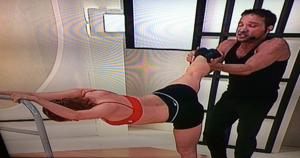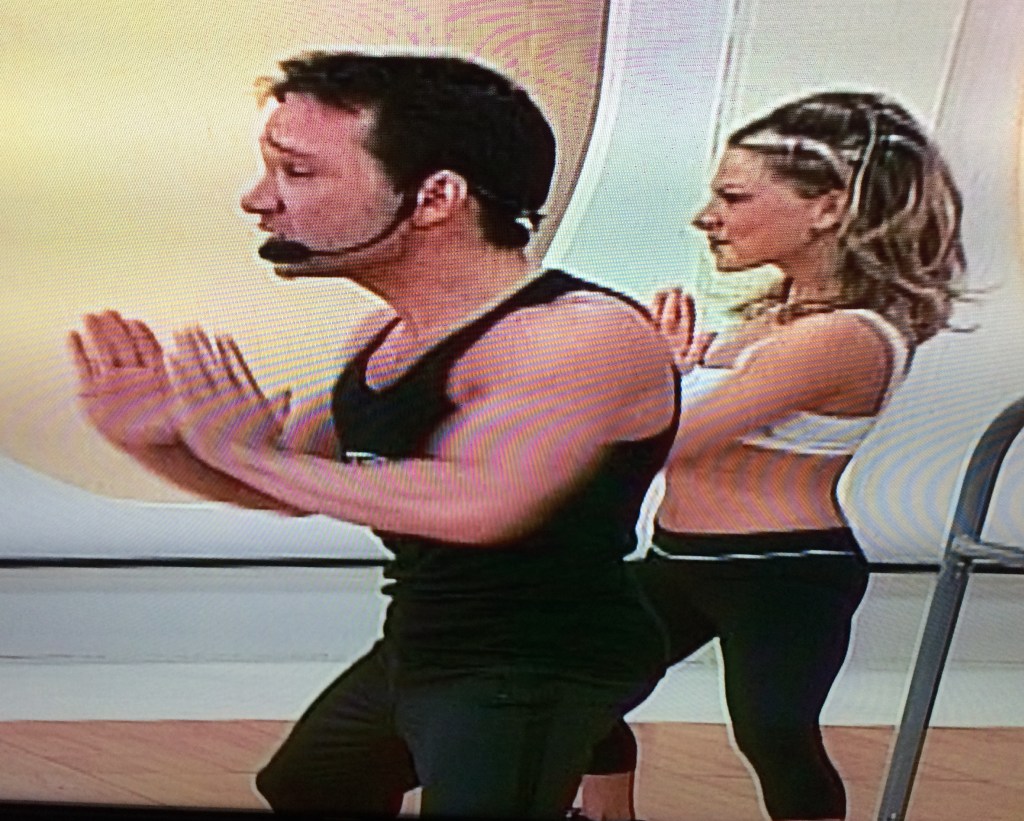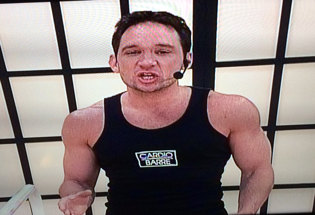 At any rate, I quickly discover that this workout has very little to do with ballet. There’s a lot of whipping your torso up and down and all around, while holding a ballet barre. It’s old-school 80’s aerobics with prima ballerina pretentions, like Heavenly Bodies meets Black Swan.