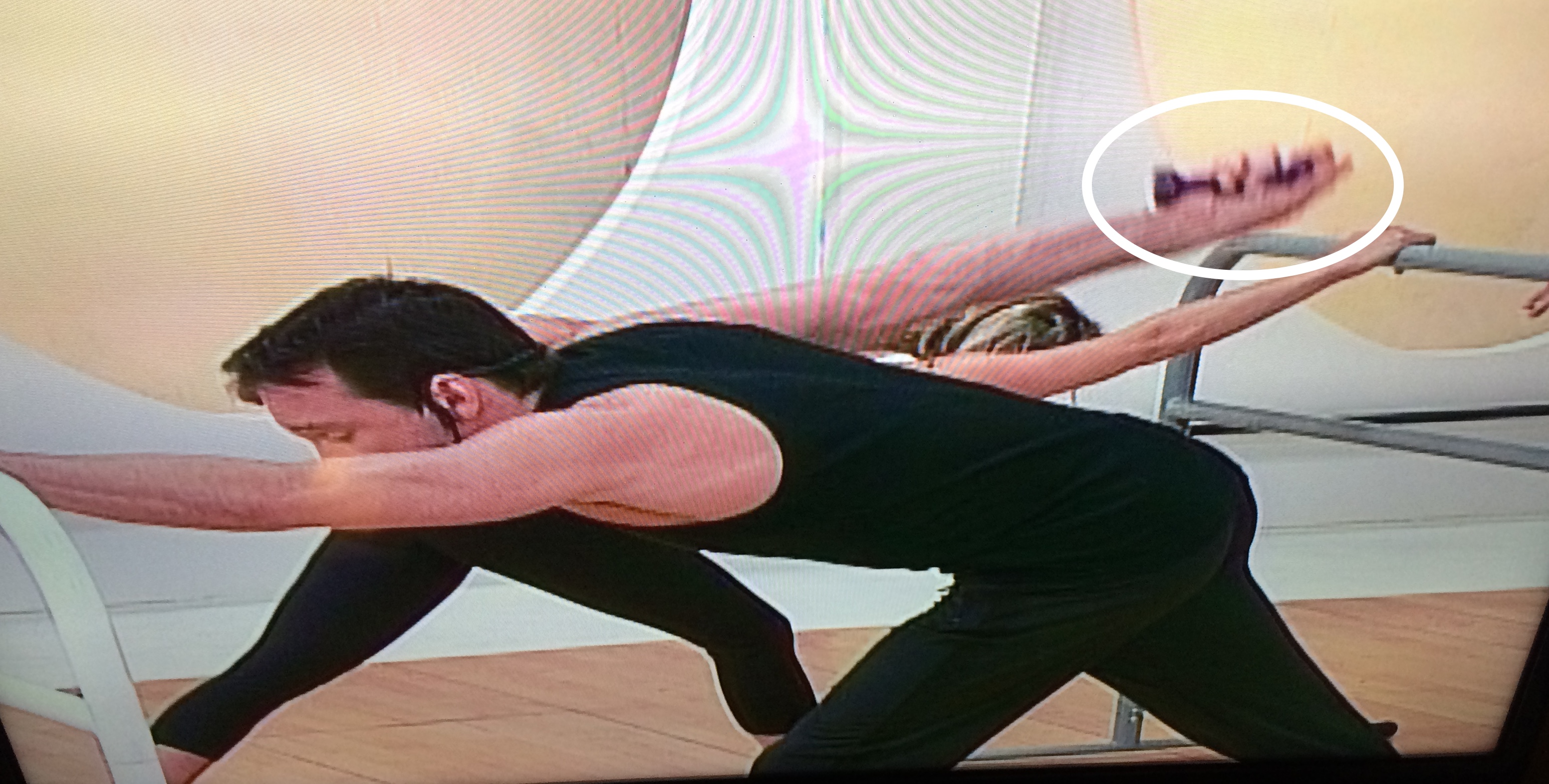 Now we bust out the one pound hand weight. Time to get jacked!  Can you see the weight? Here, I’ll circle it for you: