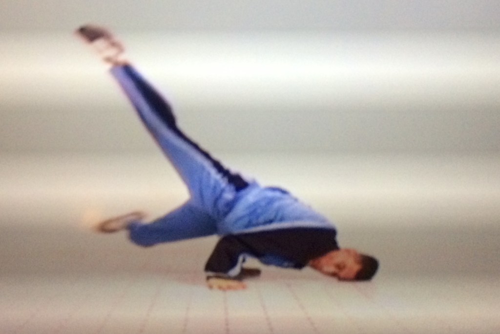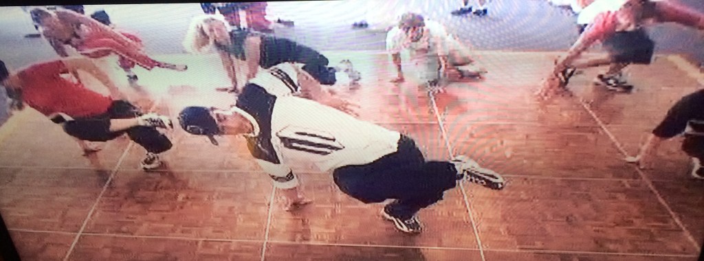 I know this step from the hip hop videos I’ve reviewed, but the instructor is adamant that it be performed with an extreme body lean forward. As for the lazy-looking backward lean that is so often taught, he stares down the camera and intones, “We don’t break like that.” Noted!