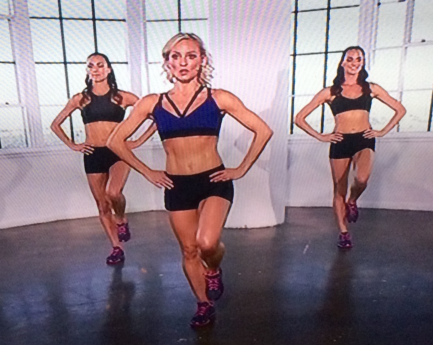 In this cardio segment, one of the dancers can’t stop laughing because her band has narrowed into a knife’s edge that threatens to bisect her legs, and she cannot believe how badly this hurts.
