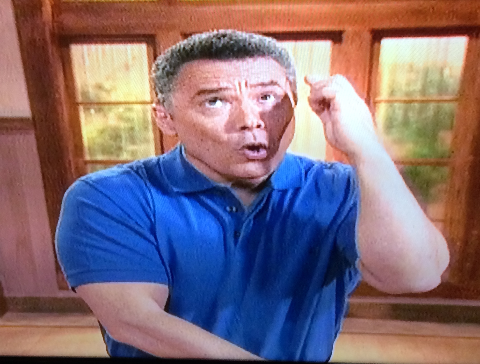 Even as he enthuses about the effectiveness of his brief workout, his self-doubt reveals itself via some decidedly awkward body language, as he ventures to put his hands on his hips, then decides against it. The camera cuts mercifully away.