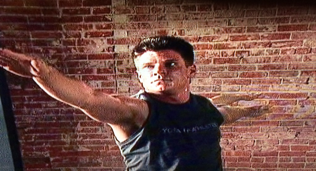 We start with some nice relaxing low-back stretches, but I can’t help but wonder…why are they watching her? What did Kimberly do, besides survive three near-death experiences by stretching, breathing, and refusing to speak Sanskrit? This workout is an enigma wrapped in a conundrum.